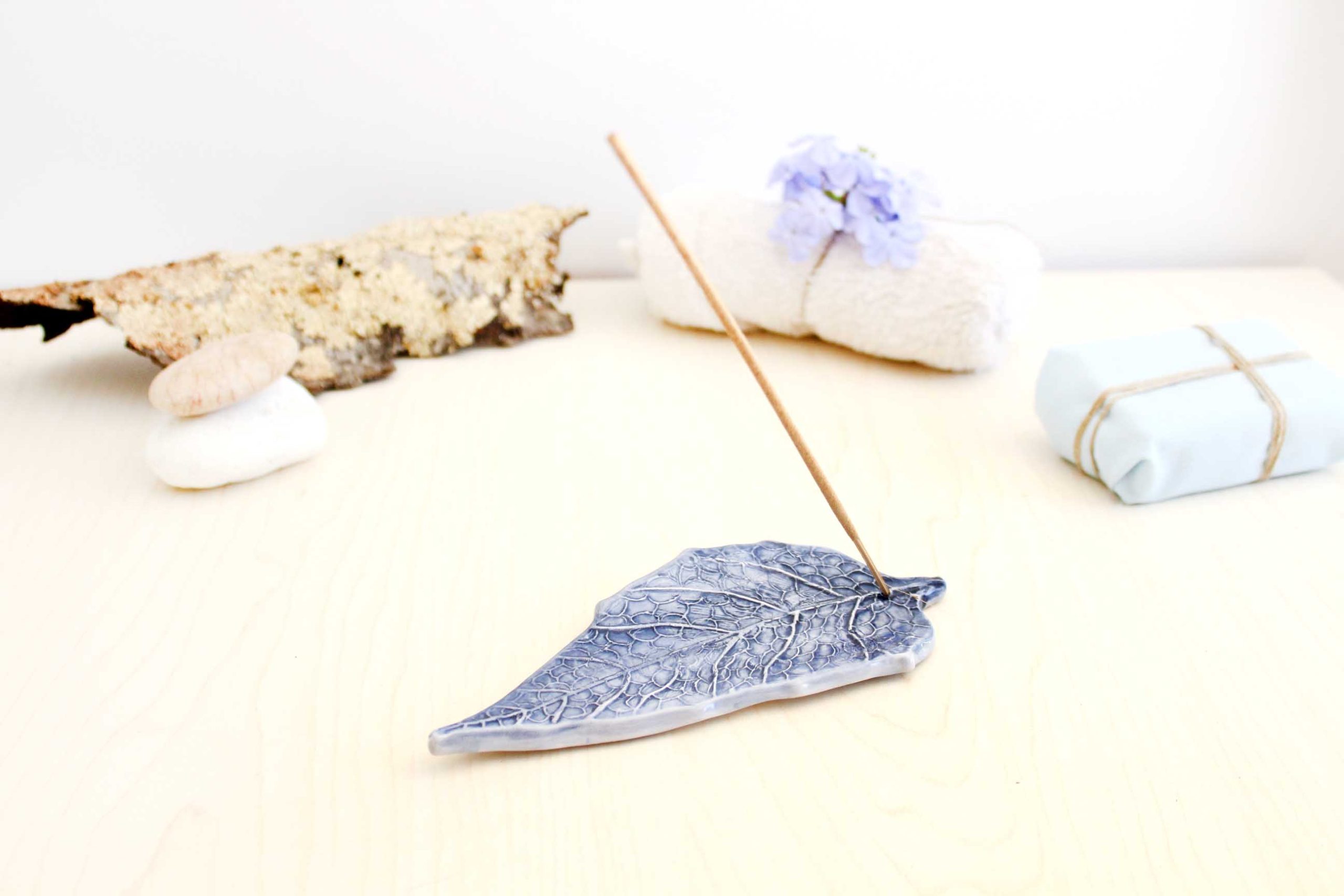 Este quemador de incienso está realizado a partir de una hoja real, modelado y pintado a mano y cocido a más de 1000ºC dos veces en nuestro pequeño horno de cerámica.