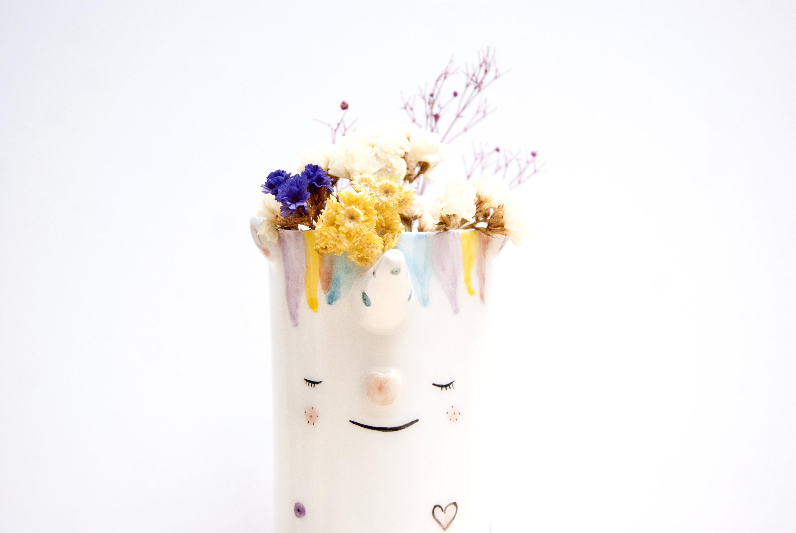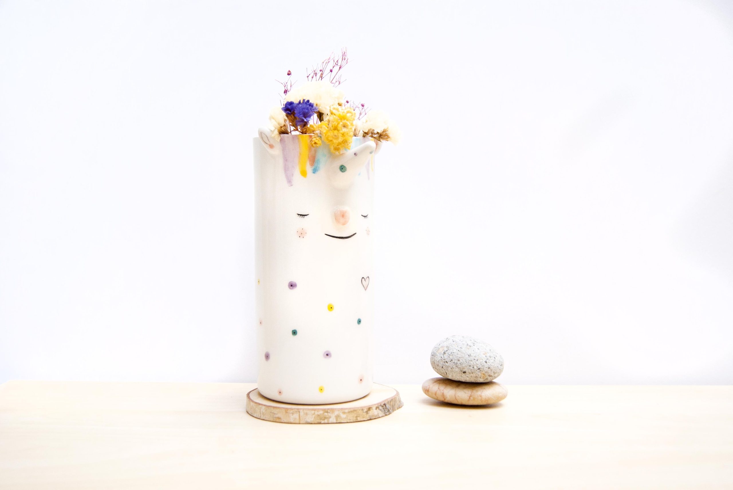 Nace del juego, la ternura y las necesidad de llenar el espacio de cosas bonitas. Victoria es una de las piezas del taller que se modelan despacito. Tiene muchos detalles tanto en la forma como el la pintura: Su cuerno, su nariz de corazón y sus lunares arco iris.